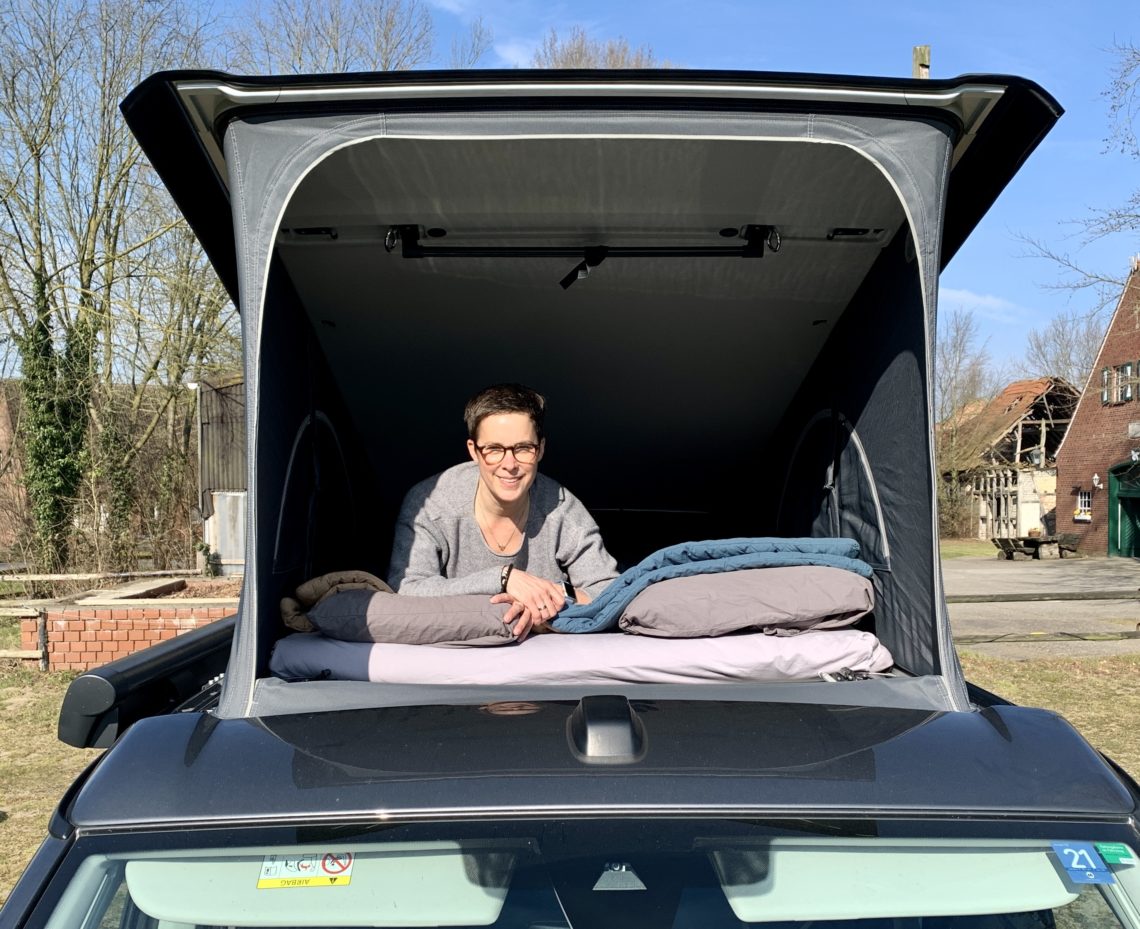 In Verbindung mit einem kleinen Polster auf der Heckablage ergibt sich beim Umklappen der Rückbank eine durchgängige und ebene Liegefläche. Natürlich spürt man die Stoßkanten der einzelnen Elemente und auch die Öffnung für die Gurtschlösser lassen sich nicht so einfach kaschieren. Dafür könnte man ab Werk eine zusätzliche Auflage bestellen, die den Schlafkomfort sicher deutlich erhöht. Da wir aber doch meistens oben schlafen wollen, haben wir uns diese Ausgabe gespart. Die Auflage nimmt dazu auch noch recht viel Platz im Kofferraum ein.