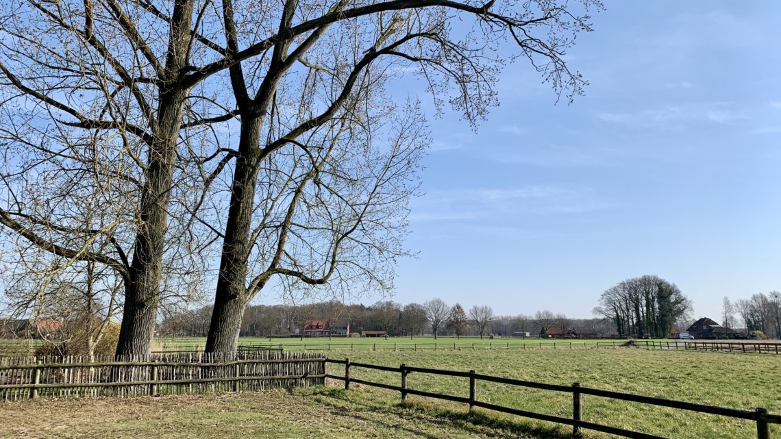 Wir haben uns für einen Stellplatz in der Nähe von Münster, genauer gesagt in Westbevern-Vadrup, entschieden. Hier stehen wir auf der Wiese eines renovierte Resthofs am Ortsrand von Vadrup, mit freiem Blick über die angrenzenden Felder. Der Stellplatz ist sehr ruhig und schön groß. In der ehemaligen Scheune des Hofs befindet sich das etwas „rustikale“ Bad, das wir nutzen können. Es steht auch eine Feuerschale samt Holz bereit, und man darf sich im Hühnerstall frische Eier holen.