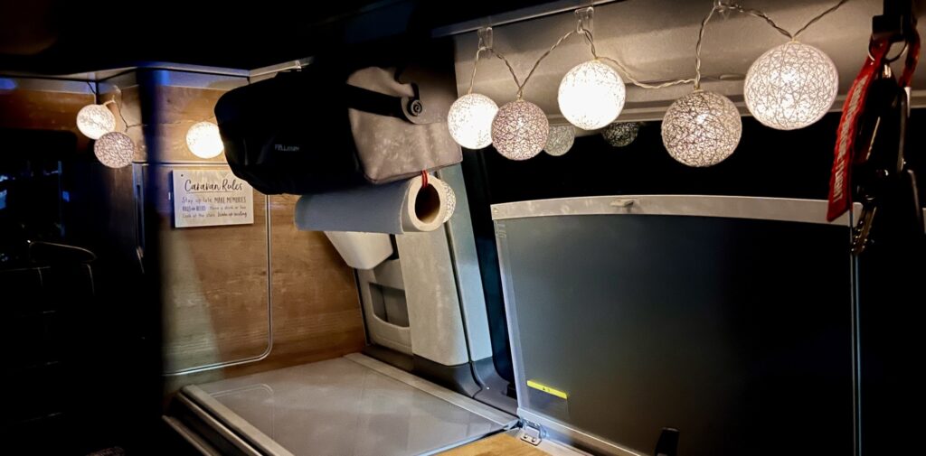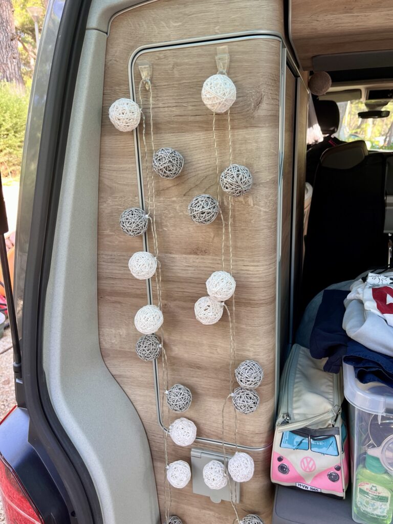 Kein Ikea-Produkt, aber mit diesen Klebehaken* können wir die Lichterketten knotenfrei verstauen. Auch über der Küchenzeile haben wir ein paar dieser Haken angebracht, um die größere Lichterkette dauerhaft im Bulli zu nutzen.