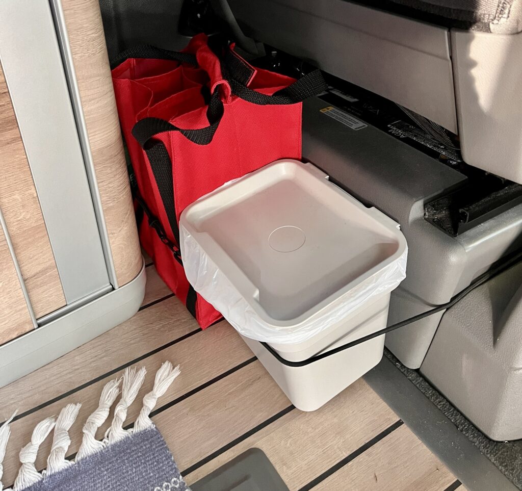 Die kleine Box HÅLLBAR nutzen wir hinter dem Fahrersitz als Mülleimer. Damit der auch während der Fahrt an Ort und Stelle bleibt, haben wir einfach eine elastische Schnur um den Sitzsockel gelegt und die Box damit festgezurrt.