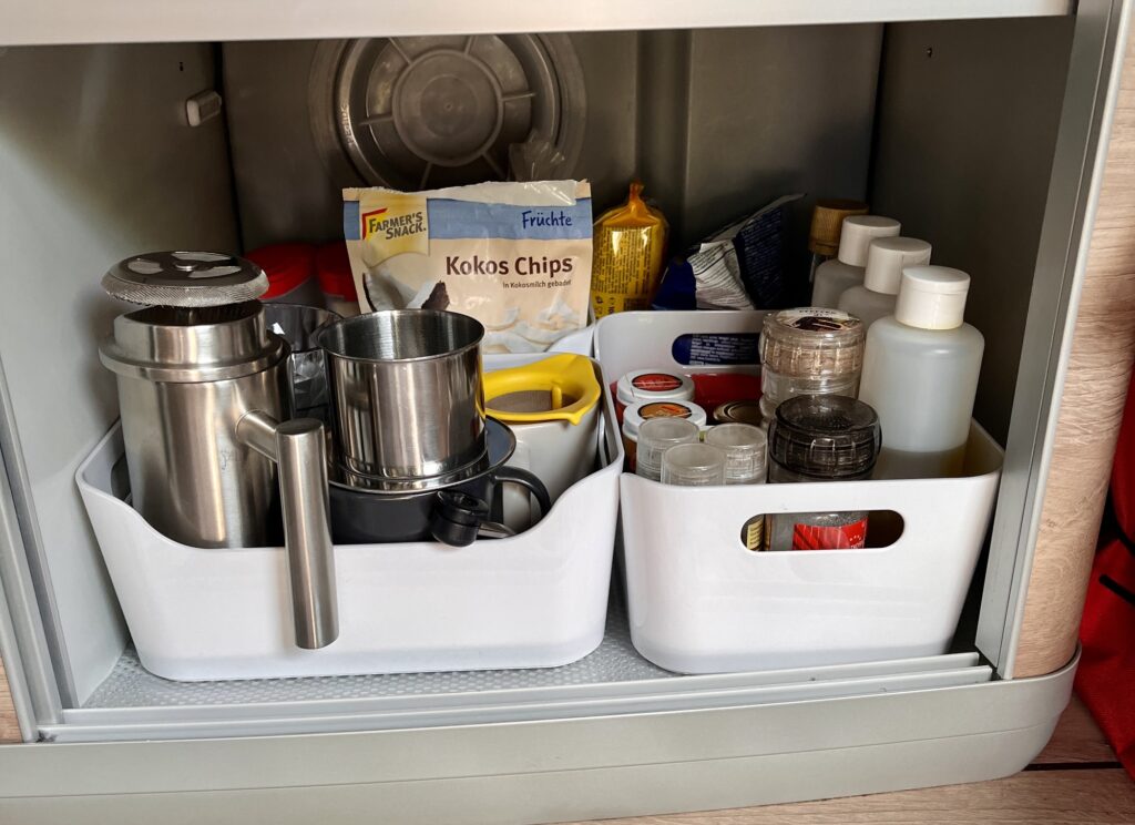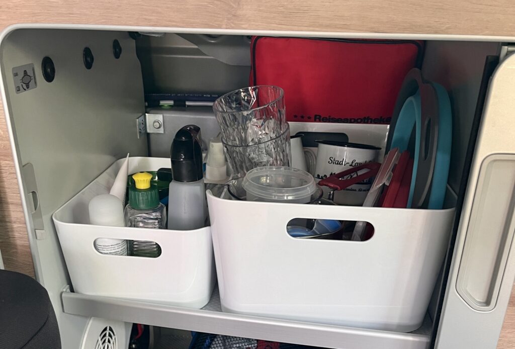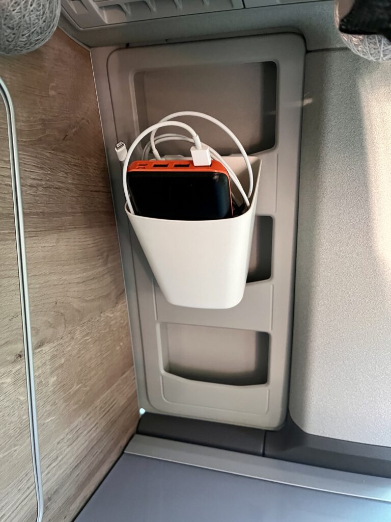 Für nur einen Euro bekommt man eine praktische Ablagebox, die sich perfekt in das Schieberegal im Lokfenster über der Kühlbox einhängen lässt. Wir haben da meist unsere Powerbanks drin.
