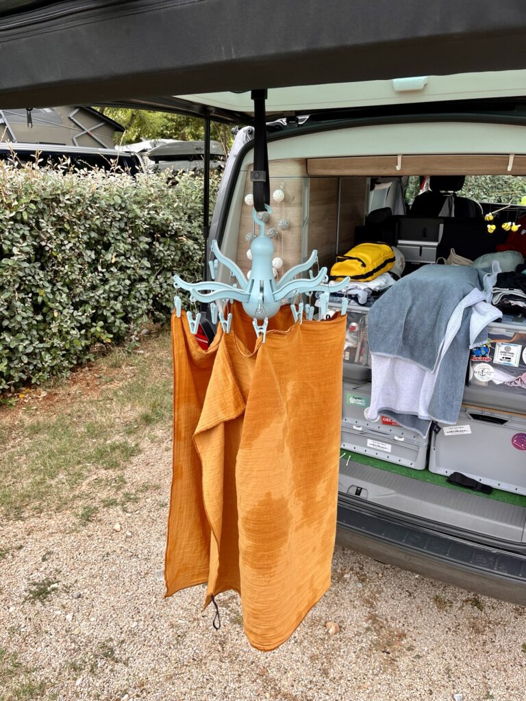Nein, keine Spinne, sondern ein Oktopus! Und der ist nicht nur hübsch anzusehen, sondern auch wahnsinnig praktisch: der Ikea PRESSA Oktopus. Lässt sich klein zusammenfalten und ist unkaputtbar. Da wir einen Coast mit manuellem Dach haben, können wir den Oktopus auch innen nutzen, in dem wir ihn an die Schlaufe im Aufstelldach hängen. So können wir auch bei schlechterem Wetter Wäsche trocknen. Aber auch am Gurt der Heckklappe hängt die Wäsche prima.