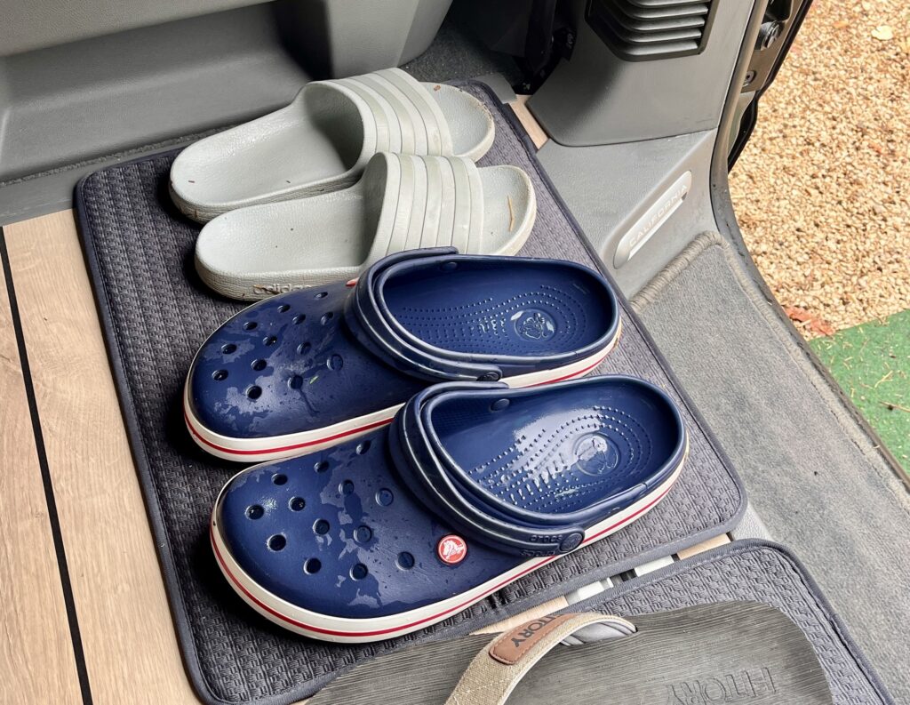 Eigentlich als Geschirrunterlage gedacht, nutzen wir zwei dieser Unterlagen als Abstellort für nasse Schuhe.