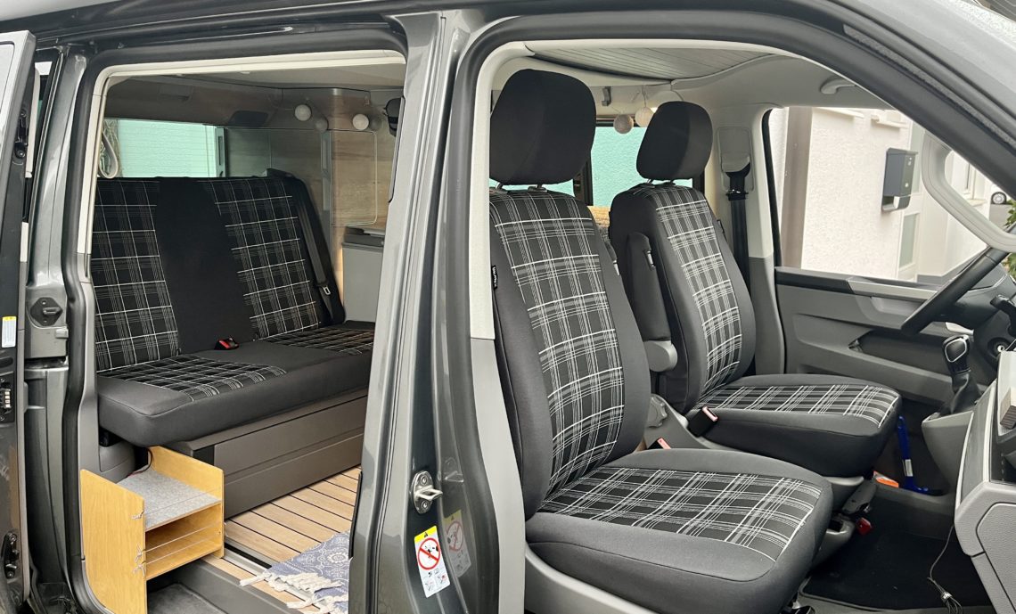 Die Sitzbezüge im Bulli sind zwar sehr schön, aber leider auch sehr empfindlich. Gerade wenn man längere Zeit unterwegs ist, gibt es wenig Möglichkeiten die Polster vernünftig sauber zu bekommen. Aber man lebt in dem Fahrzeug. Und man isst und trinkt da drin. Da geht halt auch mal was daneben. Dann kommt noch Regen dazu, der beim Einstieg durch die Schiebetür auf die Rückbank tropft. Von dreckigen Händen will ich gar nicht sprechen.